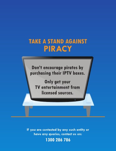 TAKE A STAND AGAINST PIRACY Don’t encourage pirates by purchasing their IPTV boxes. Only get your TV entertainment from licensed sources. If you are contacted by any such entity or have any queries, contact us on: 1300 286 786